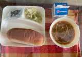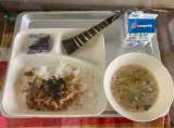 献立は、カレースープスパゲッティ、キャベツのピクルス、ミニフィッシュ、黒糖パン...
