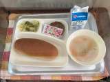 献立は、焼きハンバーグ、豆乳スープ、キャベツとピーマンのカレーソテー、黒糖パン...
