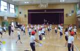 体育館で運動会の団体演技「エイサー」の練習をしました。厚紙で作ったパーランクとバ...
