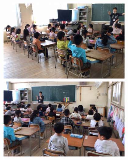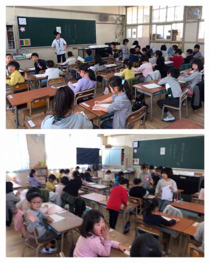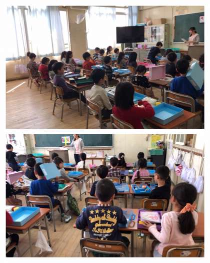 1年生3クラスの様子です。小学生になって初めての授業、担任の先生のお話をしっかり聞いて学習活動に取り組んでいます。