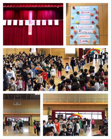 おめでとうの言葉を、児童会⇒2年⇒3年⇒4年⇒5年⇒6年⇒児童会が呼びかけます。