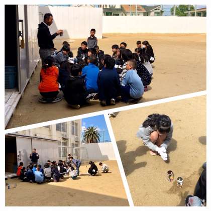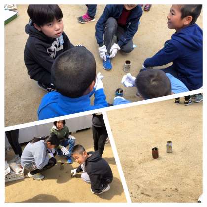 運動場の端に集合し、「燃焼」の実験に取り組んでいます。
