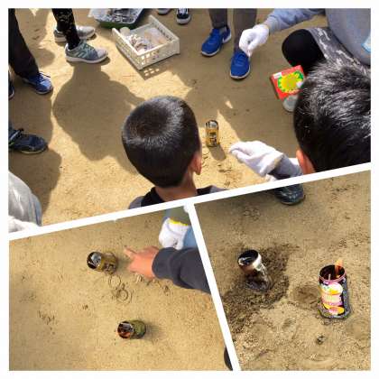 2種類の空き缶(横に穴の開いている缶と何も細工していない缶)に新聞紙と割り箸をセットします。各班が順番にマッチで点火。