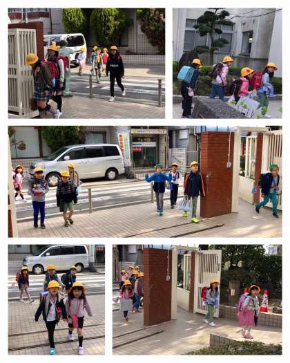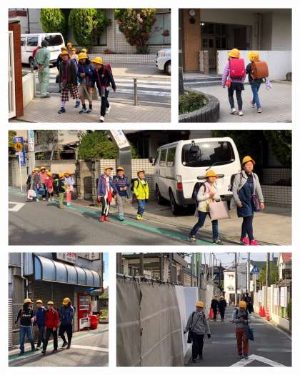 正門前の道路、車や自転車の通行と子どもたちの登校が重なり、とても注意が必要です。できる限り道路の端を歩いて歩きましょう。