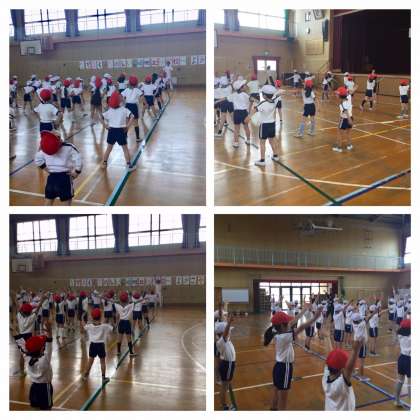 からだを前に曲げる運動では、足の間から後ろを見ます。からだをそらせる運動では、天井を見ます。体をねじる運動では、足をしっかり踏ん張って、土台を動かさない。この運動は、力強く・素早く・・・一つ一つ丁寧に体操のポイントを練習しました。