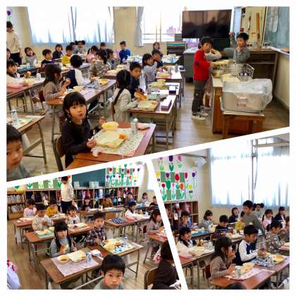 4月16日(火)、1年生の給食の様子です。今日の献立は、ビーフシチューがメインでとてもおいしいです。手を挙げて、お替りをしています。しっかり食べて丈夫なからだをつくりましょう。