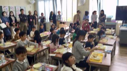保護者の方々に囲まれての給食、子どもたちはいつもと違う雰囲気に少し食べにくそう?