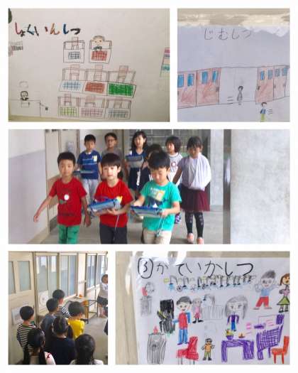 いきいき、パソコンしつ、かていかしつ、ひまわり、じむしつ、しょくいんしつ、こうちょうしつ、ほけんしつ、かんりさぎょういんしつ、きゅうしょくしつ、としょしつ、ほうそうしつ、かいぎしつ、りかしつ、ずこうしつ、じどうかいしつ・ユネスコルーム、おんがくしつ、たもくてきしつ、計18教室です。