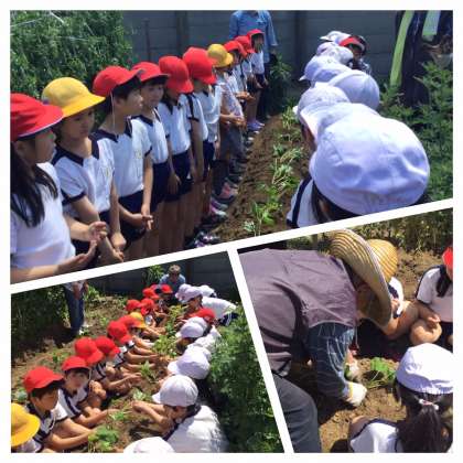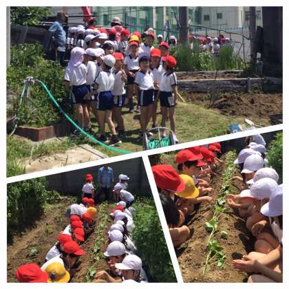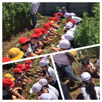 5月7日(火)3時間目、自然観察学習園の畑にさつまいもの苗を植え付けました。地域園芸クラブの方々が、事前にうねを作っていただき、各クラスごとに植え付け方法をご指導していただきながら植え付け作業を行いました。