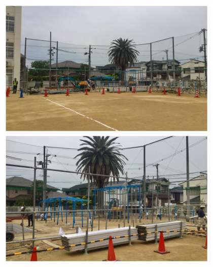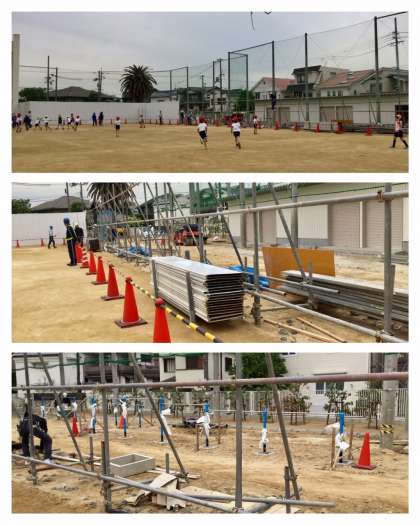 5月9日(木)、外塀の工事に伴って体育倉庫等の工事をするために運動場の一部を工事現場として確保するための簡易の塀が設置されていました。