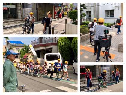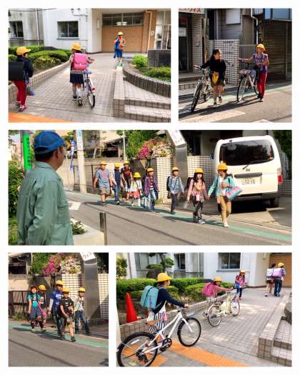 交通安全指導を1年生と4年生で実施するため、4年生の30人ほどが自転車を押して登校しています。