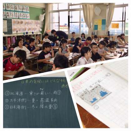 地図やグラフから考察します。ノートに丁寧に記入しています。