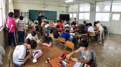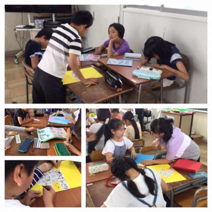 クラスの係のポスター制作です。サンプルを見て、どんなポスターにするのかイメージして班で相談。それぞれに工夫しています。
