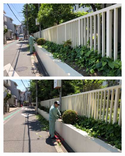 管理作業員さんは毎日、いろいろな所の環境整備をされています。今日は、通学路に面した植え込みと正門周辺の植木の手入れをしてくださっています。お手入れありがとうございます。