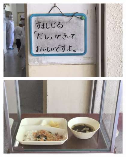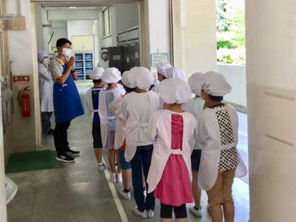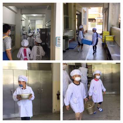 米飯の容器や食缶、牛乳などを受け取り、慎重に教室へ運びます。