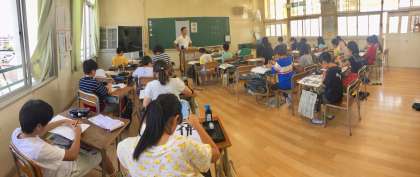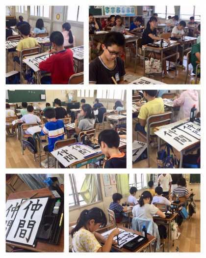 教室内はピーンと張りつめた緊張した空気が流れています。背筋が伸びた姿勢で、半紙に向かう真剣なまなざし。「仲間」2枚3枚と練習し、本番用の半紙を先生からもらって慎重に筆をおろします。