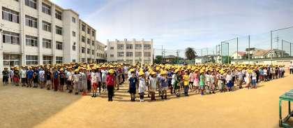 5月27日(月)、朝から気温が高く6月下旬ころの気候です。子どもたちは時間通りに整列しています。