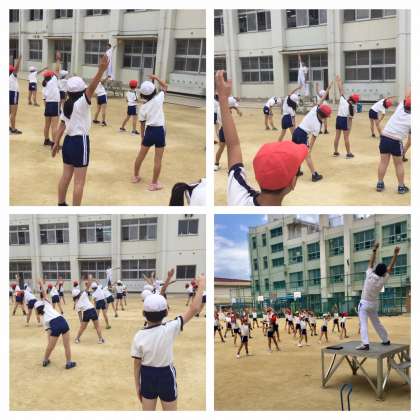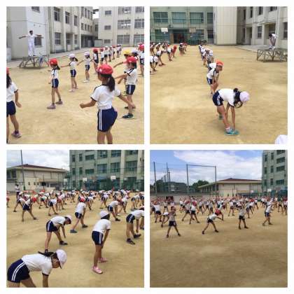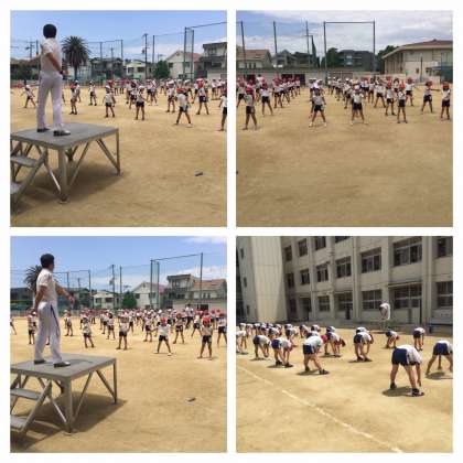 6月12日(水)3時間目、3年生全員がグランドで校長先生からラジオ体操第1の講習を受けました。