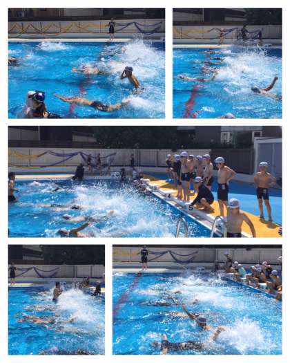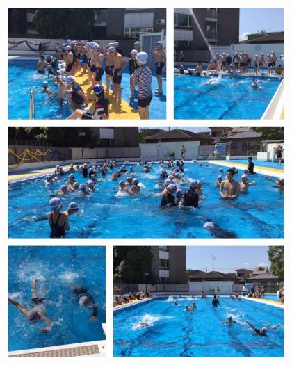 25Mを各自3本泳ぎます。5年生は、全体的によく泳いでいます。