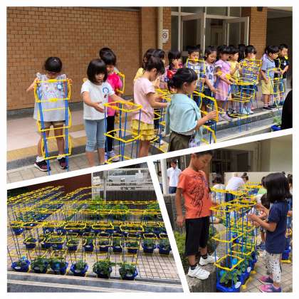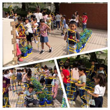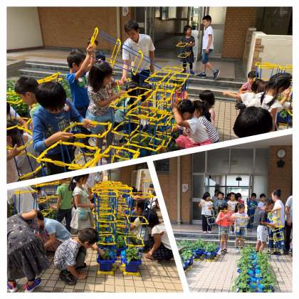 6月18日(火)1時間目、5月13日(月)に種をまいたあさがお、約1か月がたちつるが伸びて大きく成長してきました。