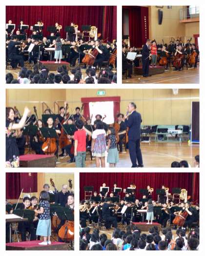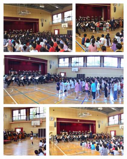 最後に、オーケストラの演奏で「校歌」を大きな声で歌い、みんなの心が一つになりました。名古屋フィルハーモニー交響楽団より、校歌CDをプレゼントしていただきました。ありがとうございました。