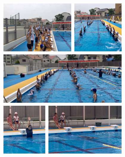 準備運動・シャワー・移動・水浴びとてきぱきと進み、プール内で「エビカニ体操」