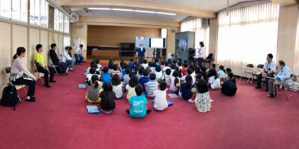 7月4日(木)、3・4時間目(3・4組)・5・6時間目(1・2組)に出前授業を行いました。大阪市環境局の方と研究員の方々をゲストティーチャーとしてお招きし、「生きものさがし」の授業をしていただきました。写真は、3・4組の様子です。