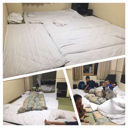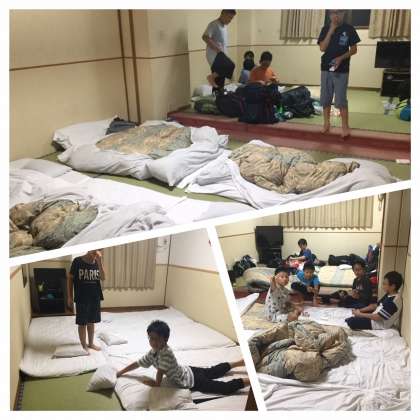きっちり布団が敷いてある部屋、まだまったく敷いてない部屋、歯磨きをしている人・・・