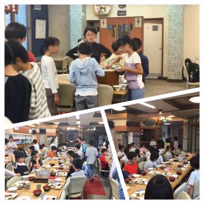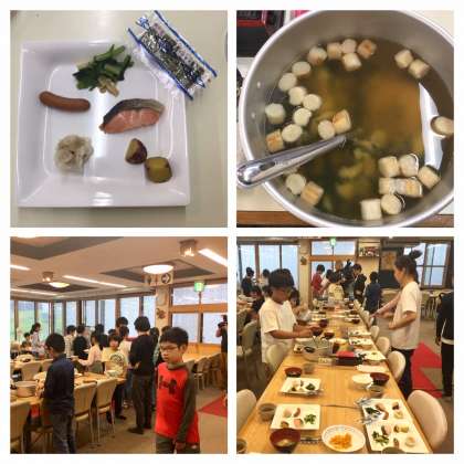 食事係さんが中心に、ごはんやお味噌汁をよそって朝食の準備です。