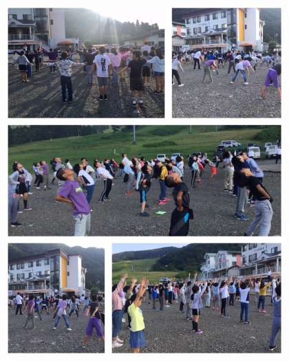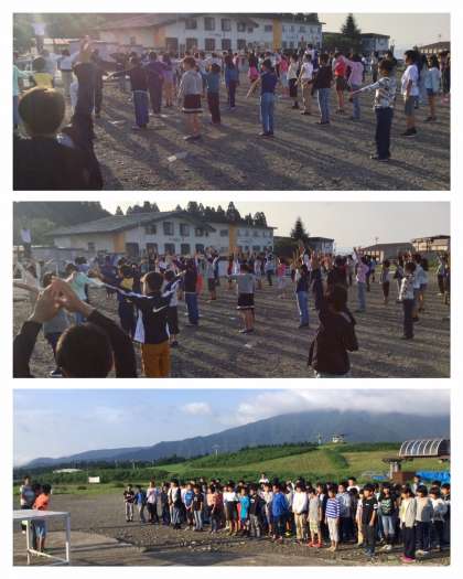 校長先生のワンポイントレッスンを受けたあと、音楽に合わせてラジオ体操第1を朝日を浴びて気持ちよく行います。