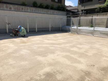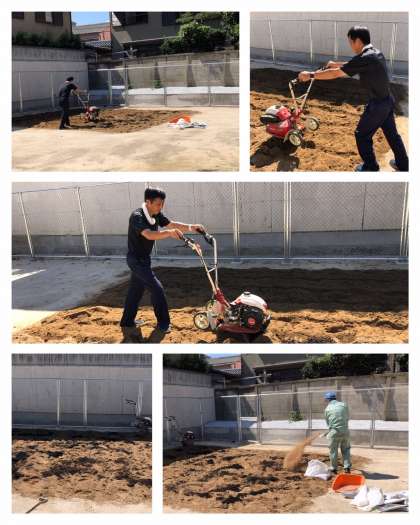 校長先生と管理作業員さんが炎天下の中、耕運機で耕し、肥料を入れて土つくりをしています。