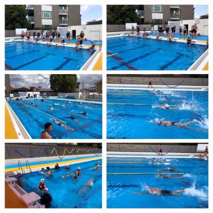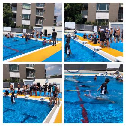 残り2コースでは、7月30日(火)に開催される水泳記録会に向けての特別練習に取り組んでいます。最後は全コースを使って、50メートルのタイムレースです。予定では、午後からも練習が組まれていましたが、暑さ指数「危険」のため中止になりました。