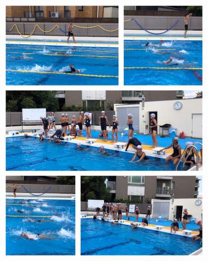 7月26日(金)10時〜10時50分、4コースを使って泳力別練習に取り組んでいます。50メートル・100メートルを泳ぐことを目指して練習に励んでいます。