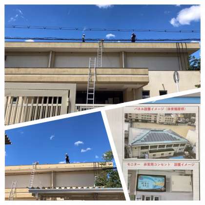 夏休み期間中に、体育館の屋根に太陽光パネルの設置工事を行っています。