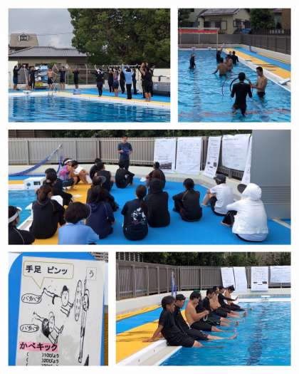 準備運動からリズムに合わせた動きを取り入れ、プール内でも低学年向けの「エビカニ体操」中・高学年向けの「エビカニ体操」を実際に行いながらの研修です。