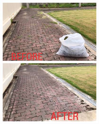 また、芝生広場周囲のインターロッキングにはびこっている雑草も、順次、取り除いています。