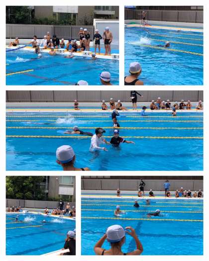 後半は、チームに分かれてのリレー対決。水中ウォークからビート板、クロール、平泳ぎ、背泳ぎ、バタフライと泳法が変わりながらのリレーです。
