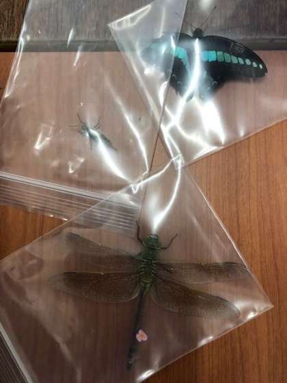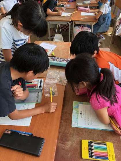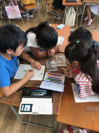 理科では、昆虫の体のつくりについて学習しています。1学期に、モンシロチョウについて学んだので、今回は、バッタやトンボなどの昆虫です。昆虫は、「頭、むね、はら」に分かれていることを本物を見ながら比べています。トンボやバッタは、学校の学習園で捕まえたり、地域で捕まえたりしたものを観察しました!チャック付きの袋に優しく入れて観察し、観察後は、逃しました!