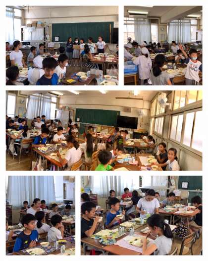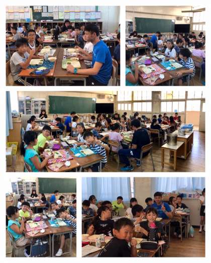 9月10日(火)給食時間、4年3組でアシスタントの舘野伶奈先生、4年4組で鈴木大輔先生が、子どもたちと一緒に給食を食べていただきました。子どもたちは大喜び。いろんな質問を投げかけていました。