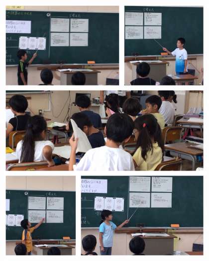 各自で考え、二人のペアで考え、代表児童が前に出て発表。それぞれに、しっかりとした考え方を堂々と発表しています。
