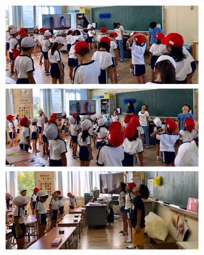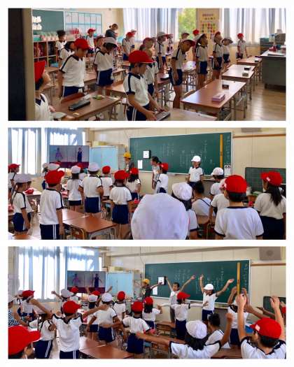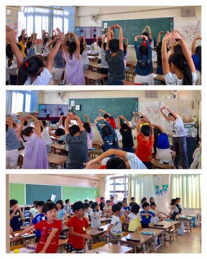 9月20日(金)、1時間目と2時間目の休み時間に学級委員が、1・2年生の教室に出向いて、整理運動の指導をしています。大型テレビに映像を流し、それに合わせてみんなでからだを動かします。