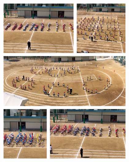 団体演技の練習では、隊形(位置)の確認をしています。