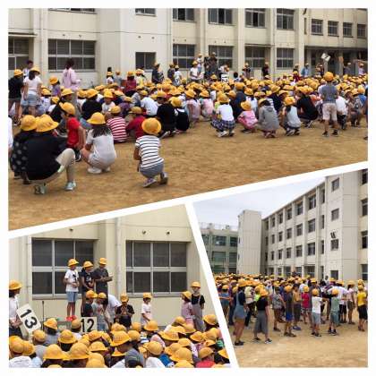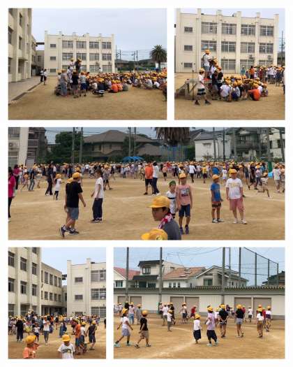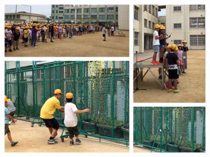 今日は、「宝探しゲーム」です。事前に集会委員がグランドのどこかへ当たりカードを隠しています。それを、ペアになって探します。