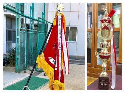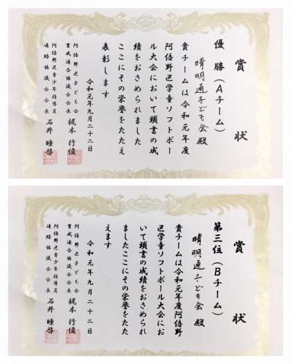 晴明通子ども会ソフトボールチームが、阿倍野区学童ソフトボール大会でAチームが優勝、Bチームが第3位に輝きました。表彰状ならびに立派な優勝旗とトロフィーが授与されました。
