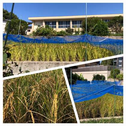 5年生が「田植え」した稲が、すくすく育ち稲穂が垂れてきました。収穫まじかの様子です。