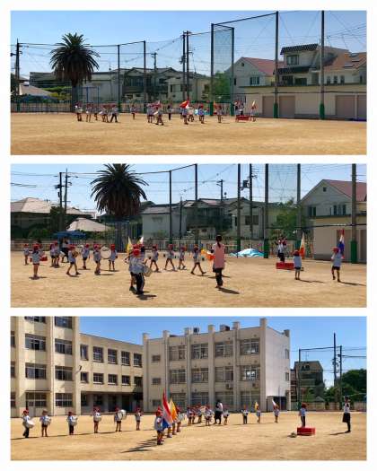 園児たちにとって広いグランドで隊形を移動しながらの演奏は大変だと思います。ガンバレ!