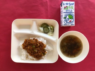 牛ひき肉、豚ひき肉、たまねぎをkレー粉、トマトピューレ、ケチャップ、ウスターソースなどを味付けし、青みにグリンピースを加えて、ごはんの上にかけて食べました。
