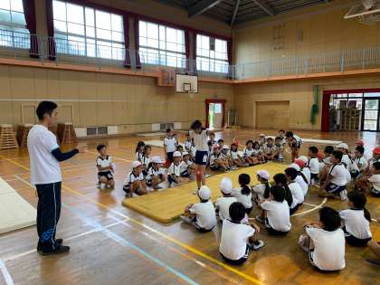 膝を閉じること、脚を伸ばすことをめあてに、前転のレベルアップに挑戦です。