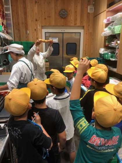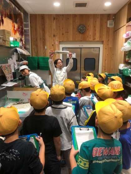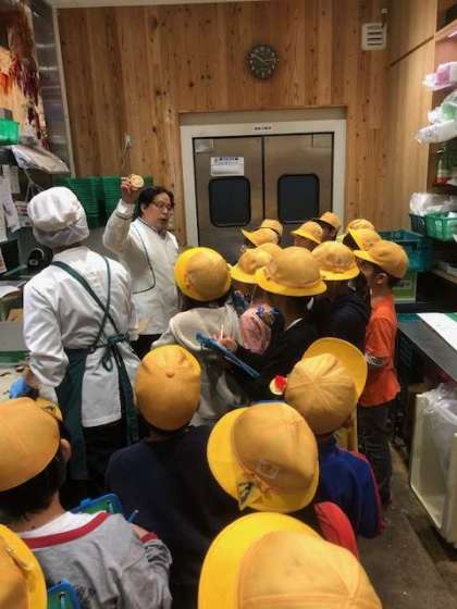 続いて、野菜や果物を切り分けたり、包装したりする場所です。大きなレンコンや白菜などを包丁で切り分けて、お客さんが買いやすい大きさにしています。野菜や果物には、基本的に賞味期限は、ないそうです。でも、空気に触れない方が長持ちする野菜や果物は、包装して、そうでないものは、そのまま陳列棚に並べられるそうです。子どもたちは、大きな包丁に釘付けでした!