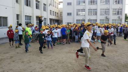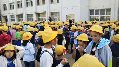 集会委員会の出すクイズをしっかり聞こうと、朝礼台の周りに